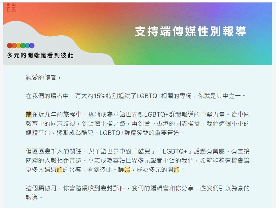 六月十號的時候,我的郵箱裡收到了一則來自端傳媒CEO丁進的郵件,它是在通知在六月這個驕傲月中,端傳媒編輯部會陸續推送LGBTQ+相關的報導給我↓