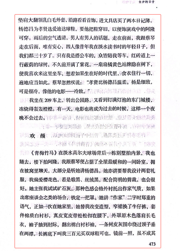 這次閱覽室想要分享的內容是和新的讀者@易安交流時她分享給我的朱天文的一篇文章《金沙的日子》(收錄在朱天文1982-2006 最好的時光(電影作品集)中,裡面有提到台灣新電影時期的人和事,尤其是在後半段記載了一些蔡琴和楊德昌戀愛即將結婚前甜蜜的日子,這對我來說很陌生,也分享給大家!以及再次感謝易安,如果不是聊到這些,閱讀這篇文章回憶起最初對台灣新電影的悸動,我快忘記了自己的承諾。